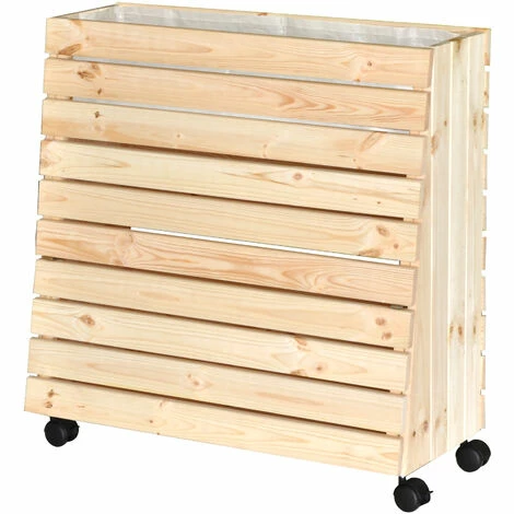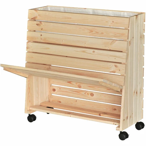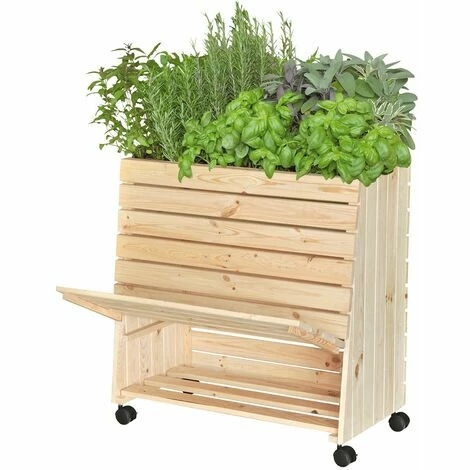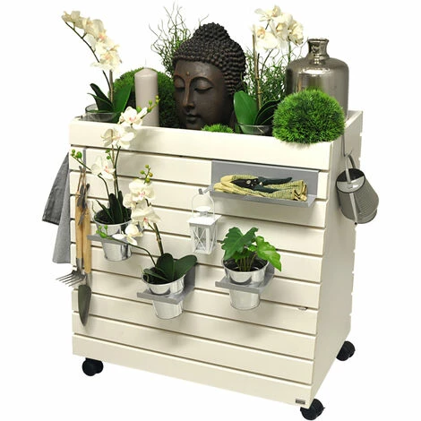 Un rabat pratique intégré dans la grille en bois et un insert au sol permettent d’utiliser l’espace de rangement à l’intérieur de la jardinière roulante, par ex. pour arrosoirs, outils de jardin & Co. Un sac à plantes en plastique spécial résistant à la déchirure peut être placé dans la jardinière et, lorsque la «GreenBOX» est utilisée à l’extérieur, rempli de terre et planté directement. Incl. Freins de stationnement et sac à plantes 780 x 300 x 200 mm.