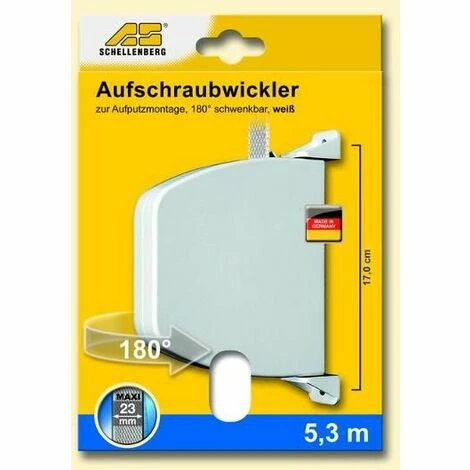 Cet enrouleur à visser robuste MAXI de Schellenberg en blanc rend le montage d’un nouvel enrouleur de sangle avec la sangle extrêmement simple, en effet une sangle de volet roulant d’une longueur de 5,3 mètres est déjà prémontée. Avec sa sangle de 23 mm de large, il convient également pour de grands volets roulants. L’enrouleur à visser Schellenberg est monté sur le mur ou le cadre de la porte ou de la fenêtre. Il peut être pivoté de 180° et grâce à son aspect discret, il s’intègre parfaitement dans votre intérieur.