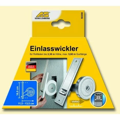 enrouleur d’entrée robuste et de haute qualité pour volets roulants sur fenêtres et portes pour courroies de volets roulants d’une largeur de 23 mm (système MAXI) et d’une longueur maximale de 5,2 m espacement des trous : 16,0 cm pour volets roulants d’une hauteur maximale de 2,3 m Dimensions (L x H x P) : 50 x 194 x 122 mm