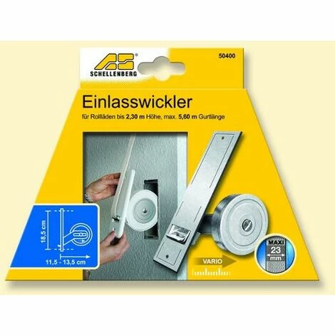 enrouleur d’entrée robuste et de haute qualité pour volets roulants sur fenêtres et portes pour courroies de volets roulants d’une largeur de 23 mm (système MAXI) et d’une longueur maximale de 5,6 m espacement des trous : 18,5 cm pour volets roulants d’une hauteur maximale de 2,3 m Dimensions (L x H x P) : 50 x 215 x 128 mm