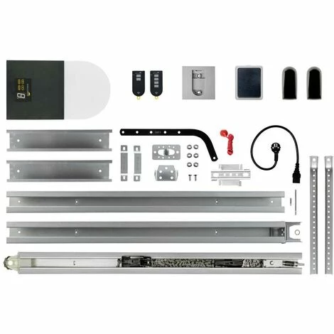 - 1 tête de moteur, 1 câble secteur, 1 x émetteur manuel, 2 canaux, 868,4 MHz, 1 x émetteur manuel, 4 canaux, 868,4 MHz, 3 rails de guidage, 100 cm chacun, 2 x raccords pour rails de guidage, 1 x butée de fixation de porte, 1 x butée de fixation murale, 2 étriers en U., 1 x déverrouillage d’urgence pour l’intérieur, 1 x chariot de guidage, 1 x bras de porte, 2 x dépendants du plafond, 1 x cadre de télécommande, 1 x bouton intérieur, 1 x barrière photoélectrique, 1 notice de montage